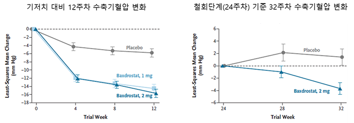 12주 시점에서 baxdrostat 1mg군과 2mg군 모두 위약 대비 유의한 혈압 강하 효과를 보였다(그림1). 구체적으로 위약군의 수축기 혈압은 평균 –5.8mmHg 감소한 반면, baxdrostat 1mg군은 –14.5mmHg, 2mg군은 –15.7mmHg 감소하여, 위약 보정 효과는 각각 –8.7mmHg 및 –9.8mmHg로 모두 통계적으로 유의하였다(P<0.001). 또한 8주간의 무작위 철회(randomized withdrawal) 단계에서 baxdrostat 2mg군은 혈압이 –3.7mmHg 추가 감소한 반면 위약군은 +1.4mmHg 상승하여, 두 군 간 차이는 –5.1mmHg였다(P=0.002). 이는 약효의 지속성과 rebound 현상이 거의 없음을 보여준다. 부가적으로 24시간 활동혈압검사를 시행한 환자 하위군 분석에서도 유사한 효과가 확인되었으며, 평균 24시간 수축기혈압은 baxdrostat 투여군에서 위약 대비 약 –15mmHg 더 크게 감소하였다. 혈중 알도스테론 농도는 60–65% 감소하였고, 레닌 활성은 반대로 상승하여 약물의 기전적 효과를 뒷받침하였다.