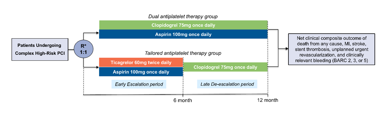 총 2018명이 등록되어 두 군으로 무작위 배정되었다. 맞춤형 항혈소판 전략군은 초기 6개월간 저용량 Ticagrelor(60mg bid)와 Aspirin 100mg 병용요법으로 강화(early escalation)한 후, 이후 6개월간 Clopidogrel 단독으로 전환하는 후기 약화 전략(late de-escalation)을 적용 받았다. 대조군은 12개월간 Clopidogrel과 Aspirin의 표준 이중항혈소판요법(dual antiplatelet therapy, DAPT)을 유지하였다. Primary composite outcome은 사망, 심근경색, 뇌졸중, 스텐트 혈전증, 예기치 않은 재관류술, 임상적으로 의미 있는 출혈 [BARC 2, 3, 5]) 이었다.