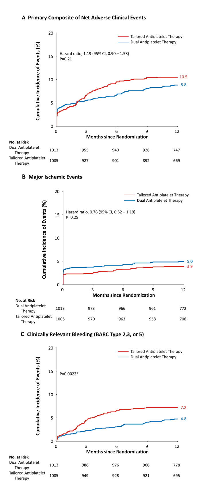 12개월 추적 결과, Primary composite outcome의 발생률은 맞춤형군 10.5%, DAPT군 8.8%로 양 군 간 유의한 차이는 없었다(HR 1.19, 95% CI 0.90–1.58, p=0.21). 주요 허혈 사건(사망, 심근경색, 뇌졸중, 스텐트 혈전증, 예기치 못한 재관류술)의 발생률 역시 두 군 간 차이가 없었다. 반면, 임상적으로 의미 있는 출혈은 맞춤형군에서 유의하게 더 높았다(7.2% vs 4.8%, p=0.002), 그러나 주요 출혈(major bleeding)의 발생률은 두 군에서 유사하였다.