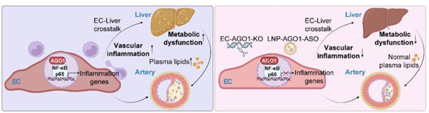 본 연구는 혈관 내피세포에서 AGO1이 핵 내 전사 보조자로서 NF-κB 신호를 증폭시키고, 그 결과로 혈관 염증과 간 대사 이상을 동시 유발한다는 점을 처음으로 명확히 제시하였다. 즉, EC 기능장애 → 간 대사저하 → 고지혈증 → 혈관염증으로 이어지는 악순환의 연결고리가 AGO1에 의해 매개된다는 것이다.