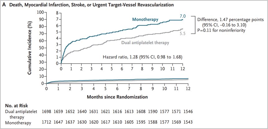 SAPT 전략은 출혈 위험을 약 60% 감소시켰으나, 허혈성 사건 억제 측면에서는 DAPT에 대한 비열등성(non-inferiority)을 입증하지 못하였다. 특히 시술 후 초기 30일 동안 SAPT군에서 허혈 사건 발생이 다소 높았으며, 다만 30일 이후부터 12개월까지는 두 군 간 차이가 거의 사라졌다.