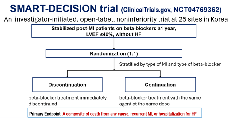 최근의 무작위 연구들이 심부전이나 좌심실 기능 저하가 없는 심근경색 환자에서 베타차단제(beta-blocker)를 일률적으로 시작하는 것은 이득이 제한적임을 보고하였지만, 최적의 베타차단제 장기 치료 전략은 여전히 불분명하다. SMART-DECISION 임상시험(ClinicalTrials.gov, NCT 04769362)은 심근경색 후 심부전이나 좌심실 기능 저하가 없는 환자에서 베타차단제 중지의 안전성을 평가하였다.