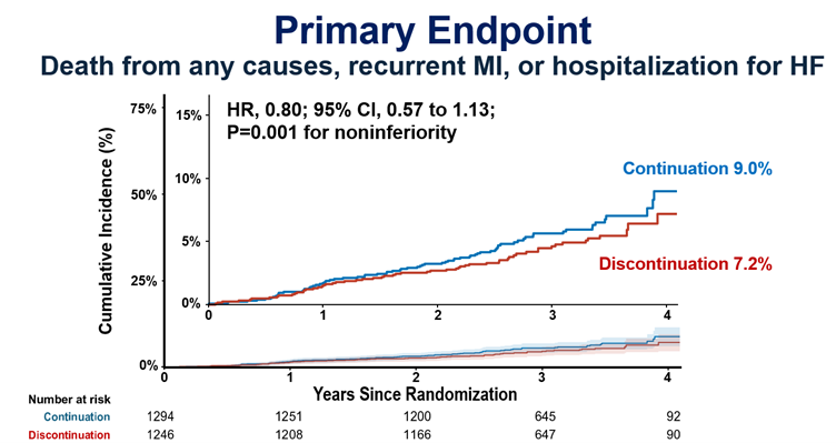 2021년 4월부터 2023년 4월까지 총 2540명이 무작위 배정(중지군 1246명, 유지군 1294명)되었고 평균 연령은 63.2세, 여성은 12.8%였다. 심근경색 발생부터 무작위 배정까지의 기간은 중앙값 4.7년(IQR 2.4–8.4년)이었다. 추적 기간(중앙값 3.1년, IQR 2.5–3.5년) 동안, 일차 평가 변수는 중단군 58명(7.2%), 유지군 74명(9.0%)에서 발생하여 비열등성을 입증하였다(HR, 0.80; 95% CI, 0.57–1.13; P=0.001 for noninferiority). 일차 평가 변수의 각 구성 요소인 사망, 심근경색, 심부전으로 인한 입원을 각각 평가했을 때도 양 군에서 유의한 차이는 관찰되지 않았다. 주요 이차 평가 변수인 뇌경색은 중단군에서 유지군에 비해 낮은 발생률을 보여 주었다. 중단군에서 혈압 및 심박수의 증가가 관찰되었으나 그 차이는 크지 않았다.