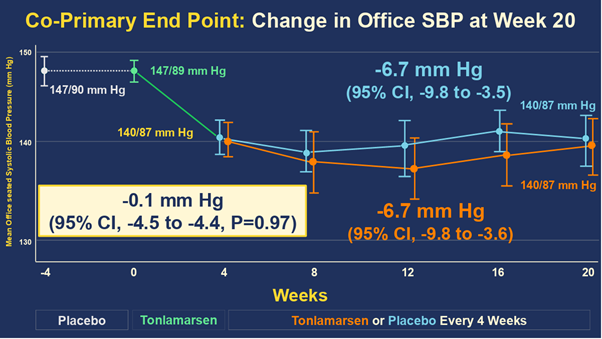 총 279명이 placebo lead-in을 받았고, 206명이 tonlamarsen 단회 투여를 받았으며, 최종적으로 198명이 무작위 배정되었다. 무작위 배정 전 평균 혈압은 147/90mmHg였고, tonlamarsen 1회 투여 후 평균 혈압은 140/87mmHg로 감소하였다.