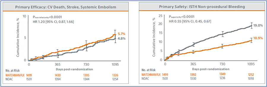 일차 유효성 평가 사건은 좌심방이 폐색술 환자군에서 81명(5.7%), 항응고제 투약군에서 65명(4.8%) 발생하였고, 좌심방이 폐색술은 항응고제보다 비열등하였다 (Hazard Ratio [HR] 1.20, 95% confidence interval(CI) 0.87-1.66, p for non-inferiority <0.001). 시술과 관련이 없는 출혈은 좌심방이 폐색술 환자군에서 154명(10.9%), 항응고제 투약군에서 260명(19.0%) 발생하였고, 좌심방이 폐색술은 항응고제보다 우월하였다 (HR 0.55, 95% CI 0.45-0.67, p for superiority <0.001).