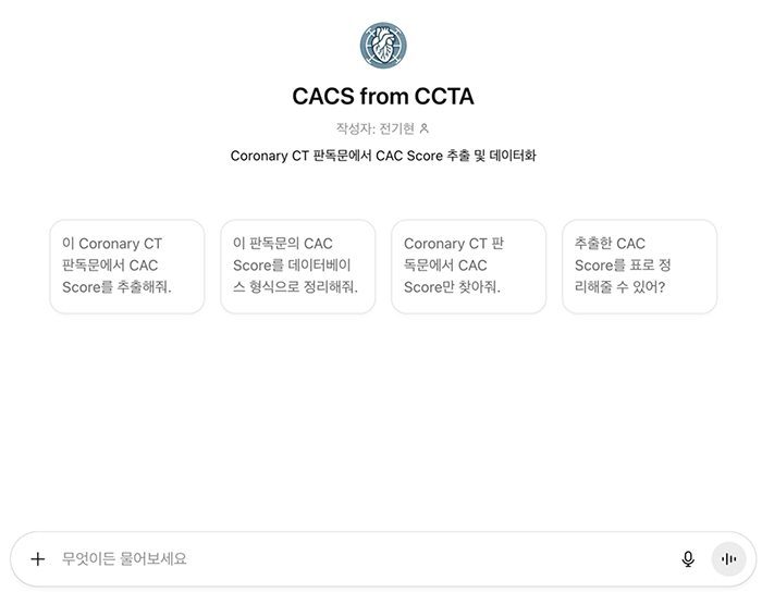 ChatGPT 에는 특정목적에 맞춰 작업을 수행하도록 하는 custom GPT 를 만들 수 있는데, 필자가 제작하여 공유한 "CACS from CCTA”는 판독문 내에서 ‘calcium score’라는 표현과 그 뒤에 오는 숫자를 자동 추출해 새로운 변수 CACS로 저장하는 과정을 전적으로 자동화하도록 설계된 custom GPT이다. 단순히 숫자만을 뽑아내는 것이 아니라, 문맥 속에서 해당 수치가 실제로 칼슘 점수를 의미하는지를 판단하고, 값이 없을 경우에는 'not reported'로 처리하여 누락 관리까지 수행한다. 또한 동일 환자의 여러 검사 기록 중에서 최신 결과를 선택하거나, 표현 방식이 다른 판독문을 통일된 형식으로 변환하는 기능도 포함할 수 있다. 이러한 일련의 과정은 NLP 기법을 대형 언어모델(Large language model, LLM)에 구현하여, 임상 문서의 복잡한 서술을 구조화된 연구 데이터로 전환하는 실질적인 예시라 할 수 있다.