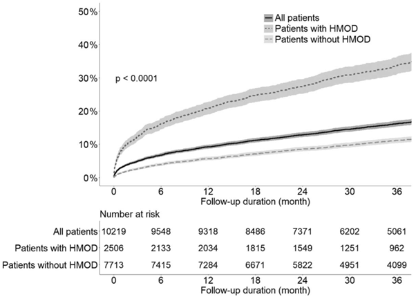 Figure. Cumulative mortality rate in all patients and in those stratified according to the presence of acute hypertension-mediated organ damage